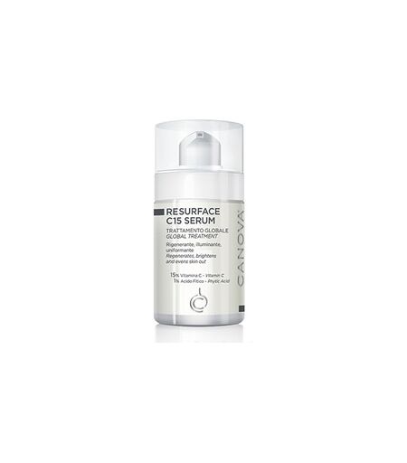 CANOVA - Resurface C15 - Serum - Descrizione Trattamento rigenerante, illuminante, uniformante dell'incarnato per la prevenzione e la correzione dei segni del chrono e photo invecchiamento. A base di Vitamina C stabilizzata al 15%, che mantiene inalterata la sua efficacia nel tempo, in associazione… ...