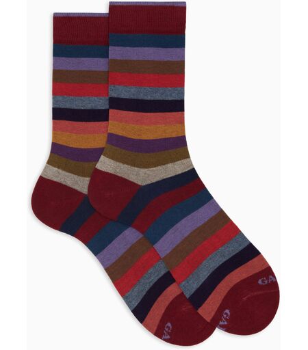 Calze corte da donna in cotone, realizzate in Italia. Incredibilmente morbide al tatto, create per una donna dinamica che non rinuncia ad un dettaglio di stile. La fantasia a righe pari nei toni del bordò le rende originali ma riconoscibili. Adatte ad un look formale o stravagante. La scritta Gallo è ricamata in punta a contrasto. ...