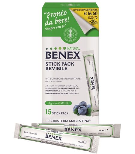 BENEX - STICK PACK BEVIBILE - Descrizione Integratore alimentare a base di estratti di vite rossa Centella asiatica e mirtillo utili in caso di gambe pesanti combinati con estratto di ananas e ippocastano che favoriscono la funzionalità del microcircolo. Ingredienti Succo di mela acqua succo d… ...