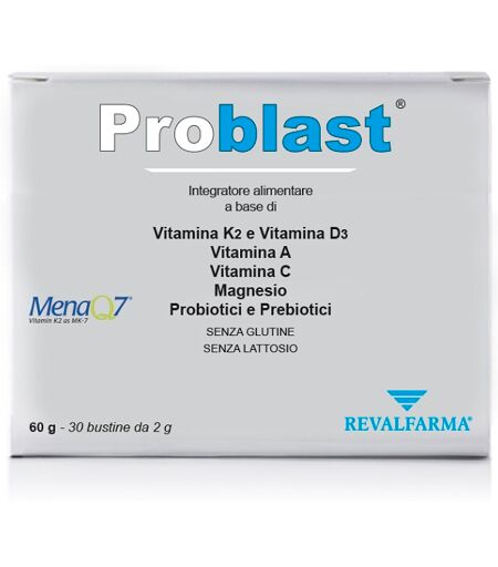 Problast - Descrizione Integratore alimentare in polvere effervescente a base di vitamina K2 e vitamina D3, vitamina A, vitamina C, magnesio, probiotici e prebiotici, utile per contribuire al mantenimento di ossa normali, favorire il normale assorbimento di calcio e fosforo, contribuire alla normal… ...