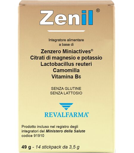 Zenil - Descrizione Integratore alimentare a base di estratto secco di zenzero microincapsulato Miniactives, citrati di magnesio e potassio, Lactobacillus reuteri, estratto secco di camomilla e vitamina B6. Lo zenzero contribuisce alla funzione digestiva ed è utile per contrastare gli stati di tens… ...