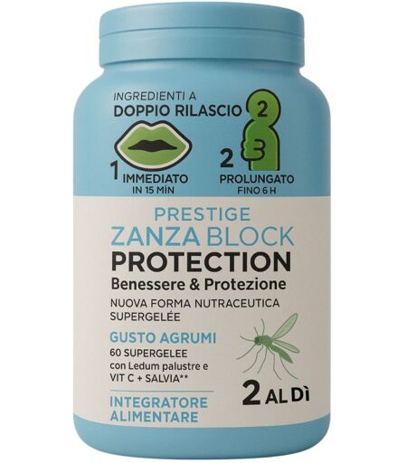 Supergelèe Zanza Block Protection è un integratore repellente naturale contro le zanzare con vitamina B1, citronella e geranio. In gelatine al gusto frutta. Formato: 60 pezzi per 30 giorni di protezione. ...