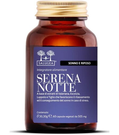 SALUGEA SERENA NOTTE - Descrizione Integratore alimentare a base di estratti di valeriana escolzia luppolo e tiglio che favoriscono il rilassamento ed il conseguimento del sonno in caso di stress. Adatto per vegani e vegetariani. Ingredienti Valeriana (Valeriana officinalis L.) radice e.s. tit. 0… ...