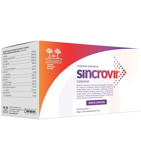 SINCROVIR - Descrizione Integratore a base di L - arginina L - ornitina monocloridrato L - citrullina acido L - aspartico glutatione ridotto ed estratto di maca che svolge azione tonica e di sostegno metabolico di muira puama e catuaba che hanno azione tonica di ginseng che svolge azione toni… ...