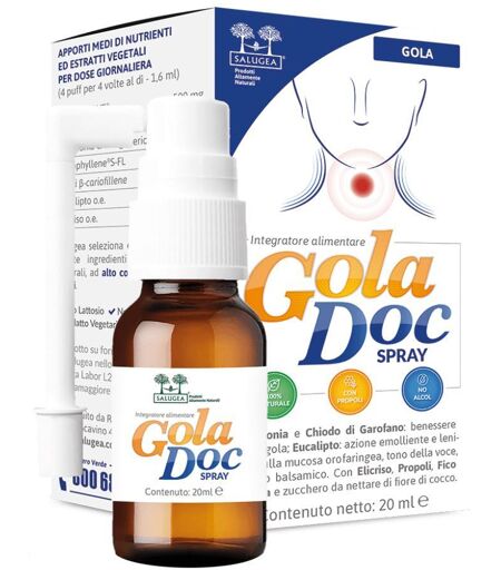 Gola Doc - Descrizione Integratore alimentare. Agrimonia e chiodo di garofano: benessere della gola; eucalipto: azione emolliente e lenitiva sulla mucosa orofaringea, tono della voce, effetto balsamico. Con elicriso, propoli, fico d'India e zucchero da netta di fiore di cocco. - Ingredienti Acqua d… ...