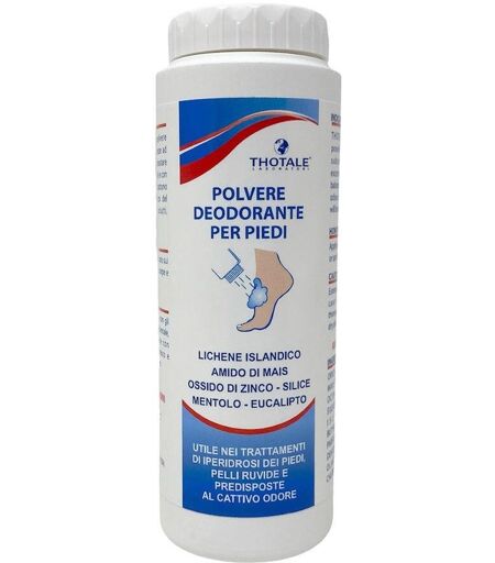 Specifiche prodottoThotale-áPolvere è una speciale polvere deodorante formulata con sostanze ad azione adsorbente (utili a contrastare l'eccessiva sudorazione del piede) e con oli essenziali balsamici che combattono il cattivo odore. Dopo l'utilizzo del prodotto, i piedi saranno asciutti, morbidi e profumati.FilosofiaThotale-áLaboratori è un brand-áBudetta Farma.Budetta Farma-áè un'azienda che da anni si prende cura dei suoi clienti con prodotti che spaziano dalla linea pediatrica a quella dermatologica, dalla linea ortopedica a quella elettromedicale; seguendo sempre standard di qualità e produzioni molto elevati.IngredientiOryza Sativa Starch, Kaolin, Zea Mays Starch, Aluminum Starch Octenylsuccinate, Zinc Oxide, Eucalyptus Globulus Oil, Cetraria Islandica Extract, Butyrospermum Parkii, Bisabolol, Parfum, Aqua, Menthol, Sodium Dehydroacetate, Silica, Piroctone Olamine, Propylene Glycol, Chlorhexidine Digluconate.Modalità D'usoApplicare con un massaggio delicato sui piedi oppure polverizzare nelle scarpe e nelle calze.Tipo di confezionamentoFlacone da 100g.AvvertenzeUso esterno. Evitare il contatto con gli occhi; nel caso di contatto accidentale, sciacquare abbondantemente con acqua. Conservare in luogo fresco e asciutto, lontano da fonti di calore.Tenere lontano dalla portata dei bambini. ...