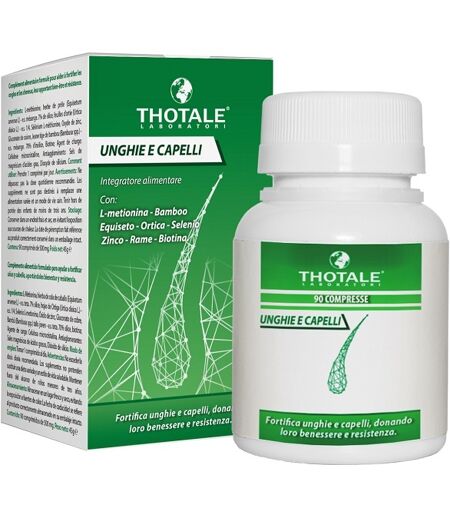 THOTALE UNGHIE E CAPELLI - Descrizione Integratore alimentare con L - metionina, bamboo, equiseto, ortica, selenio, zinco, rame,biotina. Forti ca unghie e capelli, donando loro benessere e resistenza. - Ingredienti Metionina, equiseto (Equisetum arvense L) erba - e.s. tit. 7% in silice, Ortica (Urt… ...