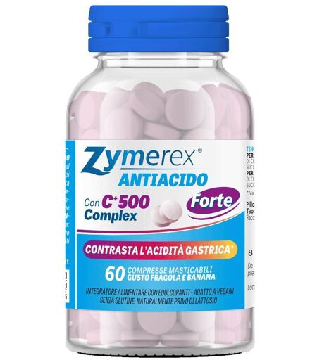 Zymerex ANTIACIDO FORTE - Descrizione Integratore alimentare a base di C+500 Complex (carbonato di calcio e polvere di banana). La banana contrasta l'acidità gastrica. - Ingredienti Carbonato di calcio; edulcoranti: sorbitolo, sucralosio; agente di carica: cellulosamicrocristallina; polvere di bana… ...