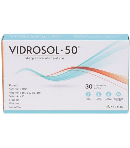 Vidrosol 50 30 compresseIntegratore AlimentareA cosa serve Vidrosol 50Vidrosol 50 è un integratore alimentare a base di folato (nella forma attiva L-metilfolato di calcio), vitamina B12 (metilcobalamina e 5'-deossiadenosilcoblamina), vitamine B1, B2, B5, B6, niacina ...