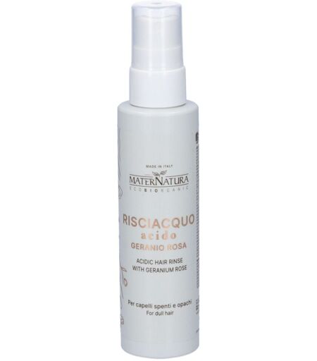 MaterNatura Risciacquo Acido Capelli al Geranio Rosa Risciacquo finale per capelli, agli acidi della frutta, già pronto all’uso. Un passaggio irrinunciabile, pre e/o post asciugatura che chiude le cuticole dei capelli facendoli apparire immediatamente più morbidi, luminosi e brillanti. Elimina i residui di calcare, depositati dall’acqua durante il lavaggio, responsabili dei capelli crespi, ruvidi e opachi. Modo d'uso: Alla fine di tutti i trattamenti, (quindi dopo aver usato shampoo, balsamo o maschera o dopo henné e/o impacchi di erbe) nebulizzare nel modo più uniforme possibile il Risciacquo Acido al Geranio Rosa sui capelli umidi, insistendo sulle lunghezze e sulle punte e facendo attenzione a evitare il contatto con gli occhi. Concludere con lo styling e l’asciugatura. Ingredienti: Aqua [Water] (Eau), Alcohol denat., Pelargonium graveolens oil, Citrus aurantium amara (Bitter orange) flower water (*), Citrus medica limonum (Lemon) fruit extract, Mangifera indica (Mango) fruit extract, Passiflora edulis flower extract, Citrus aurantium dulcis (Orange) flower extract (*), Citrus limon (Lemon) peel extract (*), Urtica dioica (Nettle) leaf extract (*), Citrus aurantium amara (Bitter orange) flower extract, Panthenol, Glycerin, Benzyl alcohol, Glycolic acid, Lactic acid. *da Agricoltura Biologica ...