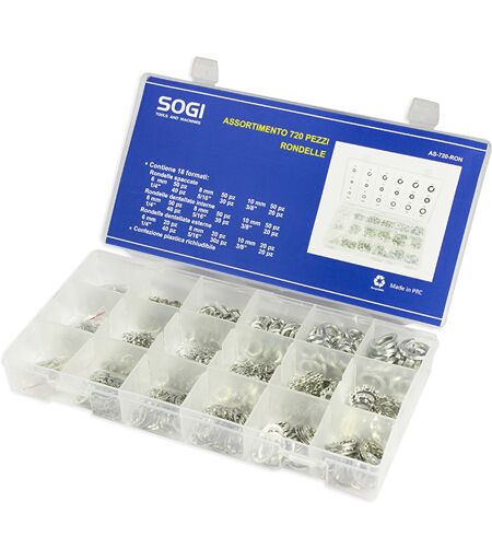 NUOVO ASSORTIMENTO SET SERIE DI 720 RONDELLE IN ACCIAIO METRICHE E POLLICI SOGIMarca SOGI Codice AS-720-RONRONDELLE IN ACCIAIO PER VITI METRICHE E POLLICI SUDDIVISE... ...