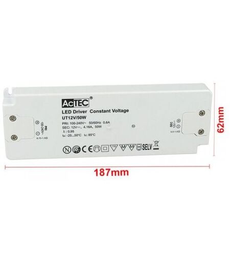 Un Alimentatore Trasformatore CV Voltaggio Costante Professionale Slim e Sottile Misura 187mm x 62mm x 22mm Marca "ACTEC" Modello UT12V/50W 12V 50W 4.16A Ideale per posto stretto come dietro allo specchio del bagno,facile da nascondere NON Impermeabile IP20 Solo Per Uso Interno ...