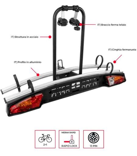 Trasporta le tue biciclette in modo sicuro e protetto con il portabici da gancio traino MENABO Merak Type S. Questo robusto e affidabile portabici è progettato per trasportare senza sforzo due biciclette, rendendolo il compagno perfetto per le avventure del weekend, le vacanze in bicicletta in famiglia o semplicemente per trasportare le tue biciclette al tuo sentiero preferito. Il Merak Type S offre una soluzione pratica e conveniente per il trasporto di biciclette, eliminando la necessità di smontare le biciclette o lottare con ingombranti portabici da tetto.Il MENABO Merak Type S vanta un design intuitivo che semplifica il carico e lo scarico. Il suo innovativo meccanismo di inclinazione consente un facile accesso al bagagliaio del veicolo, anche con le biciclette caricate. Basta inclinare il portabici verso il basso, recuperare l´attrezzatura e rialzarlo: non è necessario rimuovere le biciclette. Questa funzione è particolarmente utile per le famiglie o gli individui che hanno spesso bisogno di accedere allo spazio di carico del proprio veicolo durante i viaggi.Costruito pensando alla durata, il MENABO Merak Type S è realizzato con materiali di alta qualità per resistere ai rigori dell´uso regolare. La sua struttura robusta e il sistema di bloccaggio sicuro garantiscono che le tue biciclette rimangano stabili e protette per tutto il viaggio. Il portabici è progettato per adattarsi a un gancio traino standard, fornendo una connessione sicura e stabile al tuo veicolo. Ciò elimina il rischio di oscillazioni o movimenti durante il transito, offrendo la tranquillità di sapere che le tue biciclette sono al sicuro.Il MENABO Merak Type S è progettato anche per la praticità e la facilità di rimessaggio. Il suo design pieghevole consente un rimessaggio compatto quando non è in uso, risparmiando spazio prezioso nel garage o nel capannone. Questa caratteristica lo rende una scelta ideale per chi ha spazio di archiviazione limitato.Vantaggi principali:Trasporto senza sforzo: trasporta due biciclette con facilità, perfetto per gite di fine settimana e vacanze in bicicletta.Facile accesso al bagagliaio: il meccanismo di inclinazione consente l´accesso al bagagliaio del veicolo senza scaricare le biciclette.Costruzione durevole: materiali di alta qualità garantiscono prestazioni durature e una protezione affidabile delle biciclette.Montaggio sicuro sul gancio traino: fornisce una connessione stabile e sicura al veicolo, riducendo al minimo i movimenti durante il transito.Design salvaspazio: pieghevole per un rimessaggio compatto quando non è in uso.Funzionamento intuitivo: processo di carico e scarico semplice e intuitivo. Caratteristiche principali:Trasporta 2 bicicletteMontaggio sul gancio di trainoMeccanismo inclinabile per accesso al bagagliaioPieghevole per una facile conservazioneSistema di bloccaggio sicuroCostruzione robusta e durevoleCompatibile con un´ampia gamma di telai per bicicletteSpecifiche tecniche:Il portabiciclette da gancio traino MENABO... ...