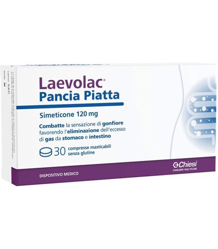 Laevolac Pancia Piatta Chiesi Dispositivo MedicoLaevolac Pancia Piatta a cosa serveFavorisce la dispersione del gas in eccesso presente nello stomaco e nell’ intestino ed è indicato nel trattamento diGonfiore gastrointestinaleFlatulenzaMeteorismoSimeticone all'interno di Laevolac Pancia PiattaIl simeticone possiede la proprietà chimico-fisica di abbassare la tensione superficiale; questa proprietà fa sì che le bolle di gas presenti nel tratto gastrointestinale confluiscano, formando gas libero, che viene facilmente eliminato.Indicazioni per l'uso di Laevolac Pancia PiattaIn caso di alterazioni dell’equilibrio della flora intestinale (indotte da disordini alimentari, stanchezza fisica e mentale, stress, cambi di stagione, viaggi all’estero, assunzione di antibiotici).Durata del trattamentoSi consiglia di assumere Laevolac Pancia Piatta Fino a 30 giorni.Indicazioni per Laevolac Pancia PiattaAdatto nei pazienti diabetici informando il medicoSenza GlutineNon ci sono controindicazioni per l’allattamento. In gravidanza, il prodotto deve essere usato solo in caso di necessità, sotto il controllo del medico.Come si assume Laevolac Pancia PiattaLa posologia per questo integratore alimentare è la seguente, si consiglia di procedere nel seguente modo:Per Adulti la posologia consigliata è di 1 o 2 compresse durante o dopo i pasti o prima di coricarsi.Per Bambini la posologia indicata è dai 6 ai 12 anni, sotto controllo del medico di 1 compressa durante o dopo i pasti o prima di coricarsi.Compresse masticabili Laevolac Pancia PiattaOgni compressa di Laevolac Pancia Piatta contiene 120mg di Simeticone.FormatoLaevolac Pancia Piatta Chiesi viene venduto in Confezione da 30 compresse masticabili. ...