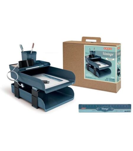 Porta in ufficio o in casa i romantici colori Vintage e goditi le nostalgiche sfumature di questi complementi: l'azzurro della carta da zucchero, il caldo colore del caramello e il bianco cremoso del latte ...E la mente torna agli anni 50 ! - 2 portacorrispondenza con distanziali - 1 bacinella - 1 portapenne - 1 righello cm.16 ...
