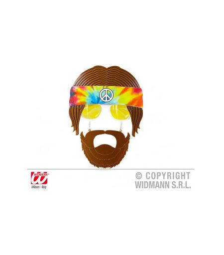 Occhiali da Hippie in plastica con lenti gialle. La montatura fa da maschera e da essa scendono due piccole catenelle con baffi e barba. ...