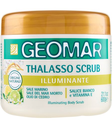 GEOMAR Thalasso Scrub è un prodotto esfoliante in grado di rimuovere dalla cute le cellule morte ed impurità, regalando una pelle morbida, luminosa, levigata ed idratata. Gli ingredienti di origine naturale contenuti nella sua formula e gli Estratti di Limone, aiutano la pelle a ritrovare la sua naturale luminsità.La sua formula contiene:SALE MARINO E SEMI DI LIMONE: rinnovano la pelle con una delicata azione esfoliante.OLI EMOLLIENTI: nutrono la pelle lasciandola morbida al tattoESTRATTI DI LIMONE: per un effetto illuminante che migliora il tono della pelleOLIGOELEMENTI DEL MAR MORTO: restituiscono alla pelle luminosità ed elasticità Svolge una spiccata azione preparatrice della pelle a ricevere i successivi trattamenti di bellezza, favorendone la penetrazione nei tessuti e massimizzandone i risultati.E' un ottimo preparatore della pelle all'esposizione al sole in quanto favorisce un'abbronzatura luminosa, uniforme e duraturo.Uso: prima di ogni utilizzo mescolare il sale e la parte oleosa con l'apposita palettina, fino ad ottenere una sospensione omogenea. Applicare sulla pelle umida, massaggiare e sciacquare abbondantemente. Se ne consiglia l'utilizzo 1/2 volte alla settimana. Svolge un'azione preparatrice della pelle a ricevere i successivi trattamenti di bellezza. ...