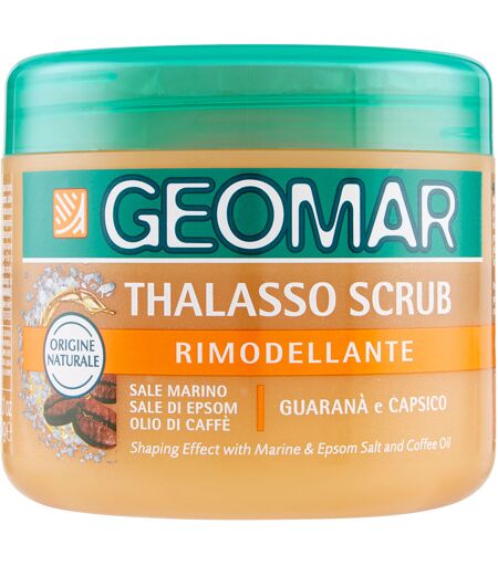 Geomar Thalasso Scrub Rimodellante è un prodotto esfoliante in grado di rinnovare delicatamente l'epidermide, levigare gli ispessimenti cutanei per una pelle dall'aspetto subito più uniforme. L'Olio di Argan ed il Burro di Karité svolgono un'intensa azione nutriente ed emolliente per una pelle più idratata e un piacevole ''effetto seta''.Sale Marino, Polvere di Caffè, Sabbia Vulcanica - Rinnovano l'epidermide attraverso una delicata azione esfolianteFitoestratto di Caffè Verde e Guaranà - Aiutano a stimolare la microcircolazioneFitoestratto di Capsico - Aiuta a migliorare la circolazione svolgendo un'azione drenanteOligoelementi del Mar Morto - Restituiscono alla pelle luminosità ed elasticitàPrepara la pelle a ricevere i successivi trattamenti di bellezza, favorendone la penetrazione nei tessuti e massimizzandone i risultati. Se ne consiglia l'utilizzo in sinergia con il Fango D'Alga Oceanica o con le Creme contro gli Inestetismi della Cellulite Geomar per un valido e completo trattamento ''rimodellante'' per il corpo.Risultati: la pelle appare subito più levigata, morbida ed idratata. L'uso continuativo, grazie all'azione sinergica del massaggio con gli elementi esfolianti e ai fitoestratti presenti, permette di levigare le imperfezioni cutanee, minimizzare le increspature, aiutare a stimolare la microcircolazione per un corpo come ''rimodellato''. Durante l'utilizzo si sprigionano note di vaniglia e ambra, rilassanti ed avvolgenti, per un intenso benessere psico-fisico. ...