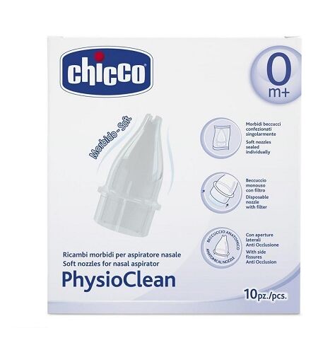 chicco Ricambi morbidi per aspiratore nasale PhysioClean Morbidi beccucci confezionati singolarmente Beccuccio monouso con filtro Conaperture laterali Anti Ocllusione 0 m+ Accessorio intercambiabile per l'igiene del bambino. Formato Confezione da 10 pezzi. Cod.0000498200000 ...