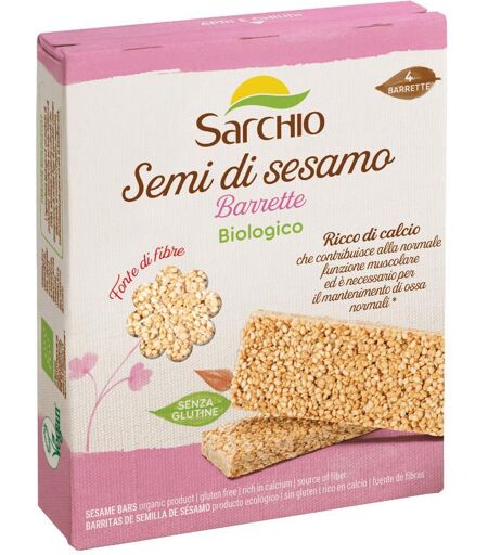 S Sarchio SNACK SEMI DI SESAMO - Prodotto dietetico biologico senza glutine, a base di semi tostati e dolcificati con sciroppo di riso, ricco di fosforo e magnesio ad alto contenuto di fibre. Scatola da 4 barrette da 20 g l'una confezionate singolarmente. Ingredienti *Sesamo (65%); *sciroppo di ris… ...