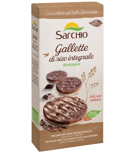 Sarchio - GALLETTE DI RISO CON CIOCCOLATO AL LATTE FINISSIMO Gallette con cioccolato al latte biologico. Con solo 82 calorie al pezzo racchiudono il giusto equilibrio tra energia, gusto e leggerezza. Naturalmente prive di glutine sono lo snack goloso idoneo per tutti non solo per celiaci. La scatol… ...