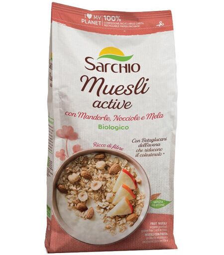 MUESLI ACTIVE - Descrizione Muesli biologico con mandorle, nocciole e mela. Contiene betaglucani dell'avena che riducono il colesterolo. Prodotto ricco di fibre. - Ingredienti Cereali in fiocchi (68%) (fiocchi di avena integrale*, fiocchi di grano saraceno*), mandorle* (12%), nocciole tostate* (8%)… ...