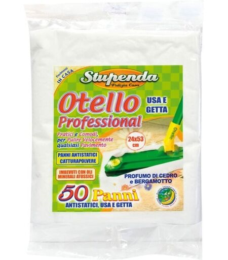 LA BRIANTINA Panni Otello Professional 50pz Cedro e BergamottoPanni usa e getta, pratici e comodi, per pulire velocemente qualsiasi pavimento. Panni antistatici catturapolvere, imbevuti con oli minerali atossici. Profumo di Cedro e Bergamotto24x53cm Caratteristiche tecniche Accessori in Dotazione ...