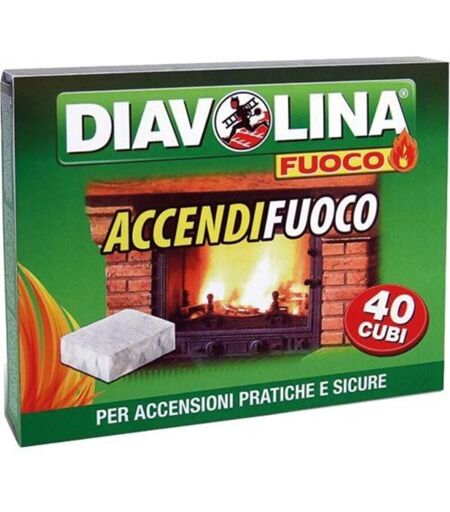 ACCENDIFUOCO DIAVOLINA CF 40PZ Confezione : 40 cubetti Accendifuoco per accensioni pratiche e sicure - Nuova confezione con etichetta richiudibile per preservare il prodotto e gli odori - 40 cubetti ...