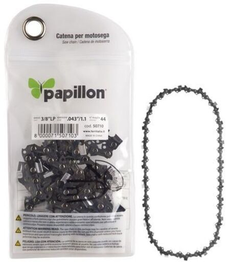 CATENA MOTOSEGA PAPILLON M:34 PASSO:3/8" SP:0,050-1,3MM N° maglie : 34 Passo : 3/8" Spessore : 0,050"-1,3 mm. Cf. in busta ...