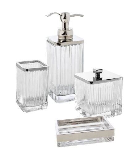 Set 2 Pezzi Vanity Vetro decorato e preziosi inserti in metallo cromato. Pompa decò in metallo. Kit composto da: bicchiere portaspazzolini e porta sapone. CP905VA Bicchiere 7,5 x 11,5 h cm CP907VA Porta Sapone 14 x 9,5 x 3,5 h cm ...