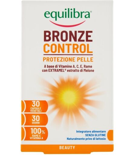 Gli integratori non sostituiscono un’alimentazione equilibrata e variegata e uno stile di vita sano. Bronze Control Equilibra® è un integratore alimentare di vitamine A, C, E Rame ed estratti vegetali. Il prodotto contiene l’estratto brevettato Extramel®; ottenuto da una varietà selezionata di melone, ricco naturalmente in antiossidanti. La vitamina A contribuisce al mantenimento di membrane mucose e pelle normali. La vitamina C partecipa alla normale formazione del collagene, per la normale funzionalità della pelle. Il Rame e le vitamine C ed E contribuiscono alla protezione delle cellule dallo stress ossidativo; inoltre il Rame aiuta la normale pigmentazione della pelle. Ingredienti: Olivo (Olea europaea L.) olio extra vergine da frutto, acido ascorbico (Vitamina C), amido modificato: amido idrossipropilato da mais; agente di resistenza: glicerolo; gelificante: carragenina; dL-alfa-tocoferolo (Vitamina E); addensante: mono e digliceridi degli acidi grassi; Melone (Cucumis melo L.) estratto secco da frutto; emulsionante: lecitina di soia; palmitato di retinile (Vitamina A) in olio di girasole; correttore di acidità: fosfato disodico; colorante: ossidi di ferro; rame ossido (Ii). Analisi media Per 1 capsula vegetale %Vnr* Olio extra vergine di oliva da frutto 191 mg Vitamina C 60 mg 75 Vitamina E 10 mg 83 Melone e.s. da frutto 5 mg Rame 1 mg 100 Vitamina A 800 mcg 100 *Vnr = Valori Nutritivi di Riferimento Assunzione consigliata: 1 capsula vegetale al giorno da assumere con un bicchiere d’acqua preferibilmente durante i pasti. Per una funzionalità ottimale del prodotto, si consiglia di iniziare ad assumerlo 15 giorni prima dell’esposizione intensiva ai raggi solari, e di continuare per 20-30 giorni dopo l’interruzione dell’esposizione stessa. Avvertenze: Non superare la dose giornaliera raccomandata.Tenere fuori dalla portata dei bambini al di sotto dei tre anni. Conservazione: Conservare al riparo dalla luce in luogo fresco e asciutto ad una temperatura non superiore ai 25°C. Il periodo di validità si riferisce al prodotto correttamente conservato in confezione integra. Contenuto netto:32 capsule vegetali = 13 g Produttore:Equilibra S.r.l. via Plava 74, Torino (TO)Italia ...