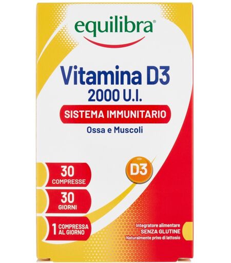 Equilibra Vitamina D3 Caratteristiche: Equilibra Vitamina D3 30 Compresse è un integratore alimentare ad alto dosaggio che fornisce 2000 UI (pari a 50 µg) di Vitamina D3 per compressa, corrispondenti al 1000% del fabbisogno giornaliero. La Vitamina D3 è fondamentale per numerosi processi fisiologici: favorisce la normale funzione del sistema immunitario, contribuisce al mantenimento di ossa sane, sostiene l’attività muscolare e regola l’assorbimento di calcio e fosforo. Particolarmente utile in caso di carenze o ridotta esposizione solare, il formato in compresse è pratico da assumere in un’unica dose quotidiana. Ideale per adulti e anziani. Integratore con 2000 UI di Vitamina D3 per compressa Contribuisce alla normale funzione del sistema immunitario Supporta la salute di ossa e muscoli Favorisce l’assorbimento di calcio e fosforo Adatto in caso di ridotta esposizione solare Alta concentrazione, 1000% del fabbisogno giornaliero Formato da 30 compresse – 1 mese di trattamento FAQ Equilibra Vitamina D3: Quanta Vitamina D3 contiene una compressa? Ogni compressa contiene 2000 UI di Vitamina D3, pari al 1000% del fabbisogno giornaliero, garantendo un apporto elevato in una sola dose. Quando è consigliato assumerla? È consigliata in caso di carenza, nei mesi invernali o in condizioni di scarsa esposizione al sole. Può essere assunta quotidianamente. Va assunta con i pasti? Sì, è preferibile assumerla durante un pasto principale per favorire un migliore assorbimento, essendo una vitamina liposolubile. È adatta anche agli anziani? Sì, è particolarmente indicata per gli anziani, che spesso presentano un ridotto livello di Vitamina D e necessitano di un supporto mirato. Può essere assunta tutto l’anno? Sì, ma è preferibile farlo nei periodi di scarsa esposizione solare o in base al consiglio del medico in caso di carenze persistenti. ...