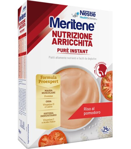Meritene NUTRIZIONE ARRICCHITA PURÈ INSTANT - Riso al pomodoro - Descrizione Alimento in polvere a basso contenuto di sale, a base di carne, verdure e riso. Ogni cucchiaio di Meritene PURÈ INSTANT fornisce tutti i nutrienti necessari per un pasto bilanciato adatto alle persone con problemi di masti… ...
