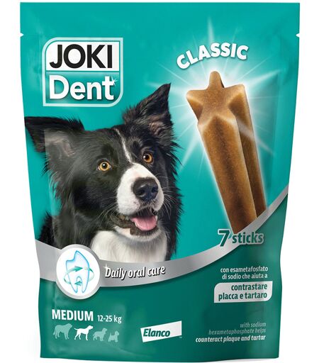Joki Dent Classic è l’alimento complementare per contribuire ogni giorno alla buona igiene orale del cane. Grazie ad ingredienti specifici come l'esametafosfato di sodio, Joki Dent Classic favorisce la salute dei denti e aiuta a contrastare la formazione della placca dentaria e del tartaro. Inoltre, grazie alla sua consistenza e alla particolare forma a stella, questo gustoso snack per cani favorisce una masticazione prolungata e contribuisce alla rimozione dei residui di cibo dai denti. INGREDIENTI: Cereali, carni e derivati, glicerolo, estratti di proteine vegetali, sostanze minerali (esametafosfato di sodio 0,6%), sottoprodotti di origine vegetale. ISTRUZIONI D'USO: Per qualsiasi taglia, 1 bastoncino al giorno. ...