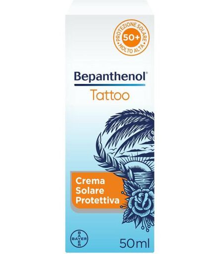 Bepanthenol Tattoo Crema Protezione Solare Molto Alta SPF50+ Per Tatuaggio, Con Pantenolo, Idrata e Rigenera la Pelle Tatuata 50ml