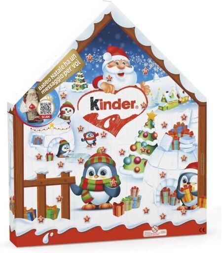 Kinder Calendario dell'Avvento contenente: 1x Kinder sorpresa - Guscio dolce con sorpresa ricoperto di cioccolato finissimo al latte 2x Kinder figura cava - Specialità dolce ricoperta di cioccolato finissimo al latte 9x Kinder mini eggs - Cioccolatini. Ovetti con copertura di cioccolato finissimo al latte e ripieno cremoso al latte e alla nocciola 9x Kinder schoko-bons - Ovetti con copertura di cioccolato finissimo al latte e ripieno cremoso al latte e nocciole 3x Kinder cioccolato - Cioccolato ripieno. Barrette ricoperte di cioccolato finissimo al latte con ripieno al latte Ingredienti KINDER SORPRESA - cioccolato finissimo al LATTE 47% (zucchero, LATTE Intero in polvere, burro di cacao, pasta di cacao, emulsionanti: lecitine (SOIA); vanillina), LATTE scremato in polvere, zucchero, grassi vegetali (palma, karité), BURRO anidro, emulsionanti: lecitine (SOIA), vanillina. Sul totale: latte scremato e latte intero in polvere e componenti solidi del latte 32%; cacao 15%. Con cioccolato ...