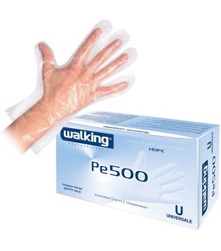 Guanti In Polietilene Monouso Walking Pe500 Guanti Monouso Pe (Polietilene) Superficie Goffrata Guanto Monouso In Polietilene Con Finitura Esterna Palmo E Dita Microgrip, Lunghi 240mm, Colore Trasparente. Idoneo Al Contatto Con Ogni Tipo Di Alimento. Pezzi Per Confezi ...