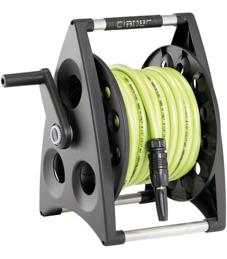 Avvolgitubo da parete pronto all`uso. Composto da un telaio in alluminio. L`avvolgitubo è fornito completo di: - 15 m di tubo da 1/2" - due raccordi automatici - lanciaspruzzo ...