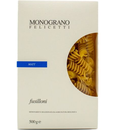 Pasta Felicetti Fusilloni Monograno Matt Gr 500 è una pasta biologica di alta qualità, realizzata con semola di grano duro Matt coltivato in Puglia e Sicilia 500 grammi ...