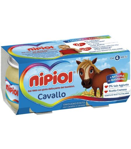 nipiol Omogeneizzato con carne di cavallo - Dal 4° mese di vita del bambino. Prodotto solo con carne di ottima qualità, selezionata e garantita; la cottura a vapore mantiene al meglio le proprietà nutrizionali. Come per legge, è senza conservanti perchè confezionato sottovuoto. Non contiene glutine… ...