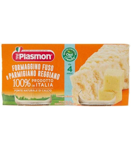 Plasmon Omogeneizzato Formaggino Parmigiano Omogeneizzato di formaggio fuso con Parmigiano Reggiano. Gusto saporito, adatto per variare il gusto della pappa del bambino. Fornisce calcio e proteine provenienti dal latte. Dal 4°/6° mese, salvo diversa indicazione del Pediatra. Ingredienti Acqua; formaggi (latte, fermenti lattici, sale, caglio) (40%, di cui Parmigiano Reggiano 20%, equivalente all'8% sul prodotto finito); amido di mais; correttori di acidità: sodio citrato, potassio citrato. Contiene latte. Caratteristiche nutrizionali per 100 gValore energetico570 kJ - 136 kcalProteine (N x 6,25)12,4 gCarboidrati (p.d.)4,8 gGrassi7,5 gSodio370 mgCalcio430 mg Formato Confezione contenente 2 vasetti da 80 g. ...