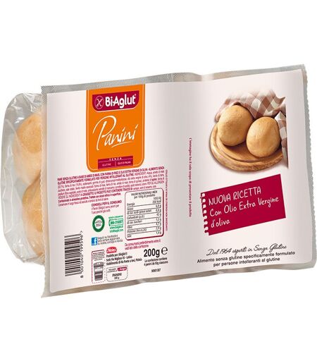 Biaglut Pane Soffice Panini I Panini piccoli e sfiziosi da farcire per gustosi spuntini o per un pasto veloce. Morbidi e con tutto il gusto del pane classico soddisfano ogni esigenza grazie alla loro praticità. Prodotto confezionato in atmosfera protettiva. Ingredienti Acqua, amido di mais (22,1%), farina di riso (15,8%), addensanti: gomma di guar, idrossi-propil-metilcellulosa; olio extra vergine di oliva (4%), lievito di birra, zucchero, sale iodato, lievito madre essiccato (farina di mais, farina di riso, amido di mais, farina di quinoa), proteine di lupino, farina di psyllium (fibra vegetale), aceto di mele, antiossidante: estratto di rosmarino; correttore di acidità: acido tartarico; aromi. PER GLI ALLERGENI VEDERE GLI INGREDIENTI IN GRASSETTO. IL PRODOTTO PUO’ CONTENERE TRACCE DI: senape, semi di sesamo, soia. Formato 4x50g. ...