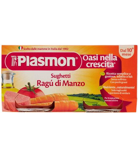 Plasmon Sughetto Ragù Di Manzo Sughetto per le prime pastasciuttine del bambino. Ricetta semplice e gustosa, senza soffritto e con pochi grassi. Contiene una porzione di verdura. Dal 10° mese, salvo diversa indicazione del Pediatra. Ingredienti Passata di pomodoro (59%); acqua di cottura; verdure (14%) (carote, cipolle); carne di manzo (10%); amido di mais; olio di girasole; sale; aromi naturali. Caratteristiche nutrizionali per 100 gValore energetico58 kcal - 242 kJGrassi Acidi grassi saturi2,0 g 0,6 gCarboidrati (p.d.) Zuccheri7,0 g 3,0 gProteine (N x 6,25)2,9 gSale0,3 g Formato 2 vasetti da 80 g. ...