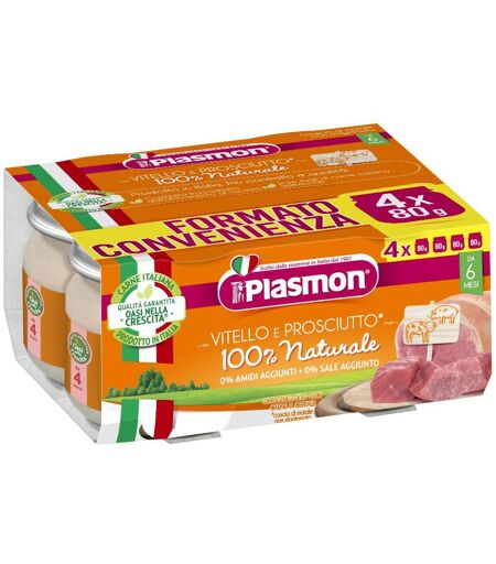 Plasmon - Vitello e Prosciutto - Senza Sale aggiunto - Dal 6° mese - Con carne vitello, prosciutto cotto e cereale, è ideale per variare ilgusto della pappa del tuo bambino, perchè unisce il sapore gradevole del vitelloalla delicatezza del prosciutto cotto (privo di nitrati, nitriti e polifosfati, … ...