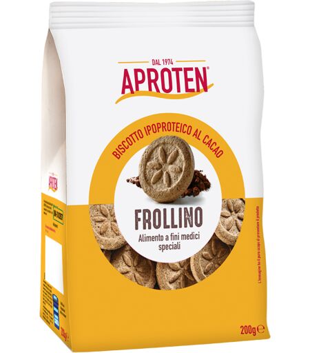 APROTEN - FROLLINO - CACAO - Descrizione Alimento a fini medici speciali. Biscotti a basso contenuto proteico con edulcoranti e cacao magro. Ingredienti Amido di mais; edulcorante: maltitolo; olio di semi di girasole, cacao magro in polvere (2,8%), inulina di cicoria, aromi; emulsionante: lecitina … ...