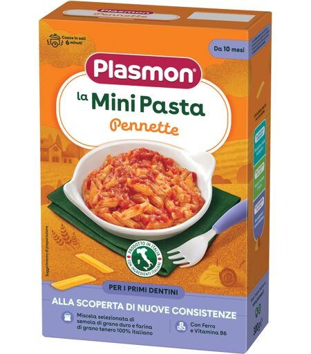 laMini Pasta Pennette Descrizione Pastina per imparare a masticare - da farine di grano tenero e semola di grano duro. Il prodotto può essere utilizzato dal decimo mese d'età. Ingredienti Semola di grano duro (49,8%), farina di grano tenero (49,7%), calcio carbonato, ferro fumarato, niacina, riboflavina, vitamina B6, tiamina. Può contenere tracce di: lupino, latte, uova. Caratteristiche nutrizionali Valori medi per 100 g Energia 1.462 kJ/345 kcal Grassi di cui acidi grassi saturi 1,3 g 0,2 g Carboidrati di cui zuccheri 70,7 g 10,7 g Fibre 4,2 g Proteine 10,5 g Sale 0,03 g Tiamina (vitamina B1) 0,7 mg Riboflavina (vitamina B2) 0,7 mg Niacina (vitamina B3) 11 mg Vitamina B6 0,6 mg Calcio 200 mg Ferro 10 mg Modalità d'uso Versare 2-3 cucchiai di Pennette Plasmon in 500 ml di acqua bollente per 5 minuti e scolare bene. Aggiungere un cucchiaio di olio. 1 cucchiaio corrisponde a circa 12 g. Le quantità sono indicative e possono variare a giudizio del Pediatra in funzione dell'età e dell'appetito del bambino. Conservazione Conservare a una temperatura compresa tra 5-25°C. Validità a confezionamento integro: 24 mesi. Formato Confezione da 480 g. Cod. 76020382 ...