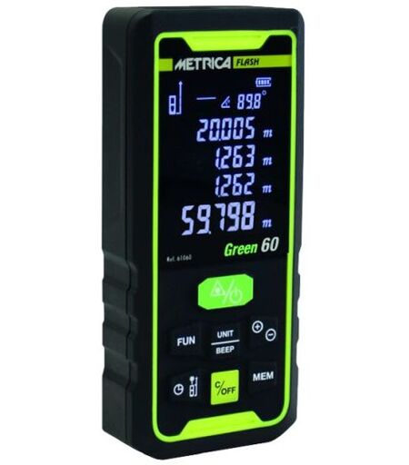 METRICA GREEN 60 DISTANZIOMETRO LASER VERDE MISURATORE METRO DISTANZA DIGITALE DESCRIZIONE Laser verde per una migliore visione Inclinometro digitale, Fiala elettronica Funzione misurazione continua, con valori max/min sempre visualizzati 4 funzioni di Pitagora (misura indiretta) Distanze, superfici, volumi Somma e sottrazione di distanze, superfici e volumi Timer di misura, autospegnimento Ritardo nella misurazione impostabile Funzione sonora: beep 99 memorie Batterie ricaricabili Cavetto ricarica Filetto 1/4” per attacco treppiede Con cinghietta, in astuccio SCHEDA TECNICA Portata Ref. 61060* fino a 60 m Precisione rilevamenti + / - 2,0 mm + (5XD*10-5) Tipo di laser 500-535 nm ...