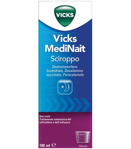 100 ml di sciroppo contengono: Principi attivi Destrometorfano bromidrato 0,05 g; Dossilamina succinato 0,025 g; Paracetamolo 2 g. Eccipienti con effetti noti: saccarosio, sodio, sodio benzoato, glicole propilenico. Per l’elenco completo degli eccipienti, vedere paragrafo 6.1EccipientiGlicole propilenico, sodio citrato, acido citrico monoidrato, potassio sorbato, sodio benzoato, macrogol, saccarosio, glicerolo, anetolo, giallo chinolina (E 104), blu brillante FCF (E 133) e acqua depurata.Indicazioni TerapeuticheTrattamento dei sintomi del raffreddore e dell’influenza.Controindicazioni/Effetti Indesiderati- Ipersensibilità ai principi attivi o ad uno qualsiasi degli eccipienti elencati al paragrafo 6.1. - Bambini e adolescenti al di sotto dei 12 anni di età. - Asma, diabete, glaucoma, ipertrofia prostatica, stenosi dell’apparato gastroenterico ed urogenitale, epilessia, gravi malattie epatiche o grave compromissione renale. - Deficit di glucosio-6-fosfato deidrogenasi ed anemia emolitica (per il contenuto di paracetamolo). - Storia di emorragia gastrointestinale o perforazione dovuta a precedenti trattamenti con medicinali ad attività anti-infiammatoria, anti-piretica e antidolorifica o storia di emorragia/ulcera peptica ricorrente (due o più episodi distinti di dimostrata ulcerazione o sanguinamento). - Grave insufficienza cardiaca. Non somministrare contemporaneamente o nelle due settimane successive a terapia con farmaci antidepressivi inibitori delle MAO.Posologia Posologia Adulti e adolescenti oltre 12 anni: La dose raccomandata è 30 ml una volta al giorno. 30 ml contengono 0,015 g di destrometorfano bromidrato, 0,0075 g di dossilamina succinato e 0,6 g di paracetamolo Non superare le dosi raccomandate. Durata di trattamento Dopo 3 giorni di impiego continuativo, in assenza di risultati apprezzabili, rivalutare il quadro clinico. Modo di somministrazione Vicks MediNait va assunto prima di coricarsi per il riposo notturno e a stomaco pieno. Servirsi del bicchiere dosatore incluso nella confezione.AvvertenzeGli effetti indesiderati possono essere minimizzati con la durata di trattamento più breve possibile che occorre per controllare i sintomi. Gli anziani hanno una maggiore suscettibilità all’insorgenza di effetti indesiderati. Una tosse cronica o persistente dovuta a fumo, enfisema, asma richiede una valutazione clinica. In caso di tosse irritante con una notevole produzione di muco Vicks MediNait deve essere usato con particolare cautela e dopo un'attenta valutazione del rischio-beneficio. Dosi elevate o prolungate di paracetamolo, presente nel prodotto, possono provocare un’epatopatia ad alto rischio ed alterazioni a carico del rene e del sangue anche gravi. Il paracetamolo va utilizzato con cautela in soggetti con insufficienza renale o epatica, inclusi quelli con epatopatia non cirrotica alcolica. I danni da sovradosaggio sono maggiori nei soggetti affetti da epatopatia alcolica. Vicks MediNait non deve essere usato con altri prodotti... ...