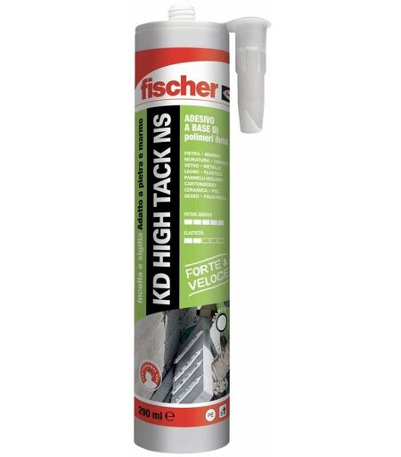 Adesivo sigillante KD HIGH TACK NS Adesivo ad altissima presa iniziale a base di polimeri ibridi con effetto ventosa Materiali di supporto: Idoneo per: ul li Pietra, marmo li Specchi li Ceramica li Vetro li Plastiche (es. PVC, vedere eccezioni) li Pannelli isolanti (es. Polistirene) li Metallo (es. Acciaio, alluminio, rame) li Legno (es. Travi e pannelli in legno) li Calcestruzzo (normale, alleggerito e cellulare) li Muratura (in laterizio e silicato di calcio) con e senza intonaco li Gesso (es. Cartongesso, gessofibra) Non idoneo per: ul li Plastiche (PE, PP, Teflon - PTFE) li Silicone e substrati bituminosi Vantaggi: ul li Altissima presa iniziale ( 290 kg/m2). Nella maggior parte delle installazioni non servono supporti. Li Elevata resistenza a trazione e sforzi di taglio dopo l'indurimento. Li Non macchia pietra naturale e marmo, non corrode i metalli. Li Ugello sagomato a V per migliorare l'applicazione. Li Verniciabile con vernici a base acquosa o sintetiche. Li Non contiene ...