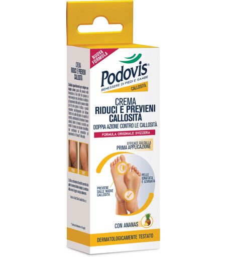 Podovis CREMA RIDUCI E PREVIENI CALLOSITÀ DOPPIA AZIONE CONTRO LE CALLOSITÀ Descrizione Svolge un'azione correttiva e preventiva degli ispessimenti e delle callosità della pelle. La formulazione contiene 2 principi attivi: Urea, che riduce le callosità e gli ispessimenti della pelle, ed esclusive microsfere anti-sfregamento che limitano l'attrito tra la pelle del piede e le superfici di contatto contrastando la formazione di nuove callosità. La formulazione è arricchita con un estratto di Ananas, per un'azione cheratolitica che contribuisce ad ammorbidire gli ispessimenti della pelle. Risultati visibili dopo 3 giorni. Dermatologicamente testato. Modalità d'uso Utilizzare la crema su piedi puliti ed asciutti. Applicare quotidianamente su tutta la superficie del piede, insistendo su durezze e callosità. Componenti Aqua, urea, stearic acid, isopropyl myristate, cetyl alcohol, allantoin, polyethylene, lauryl glucoside, tocopheryl acetate, menthol, phenoxyethanol, parfum, DMDM hydantoin, glycerin, tetrasodium glutamate diacetate, sodium dodecylbenzensulfonate, algae, benzyl salicylate, butylene glycol, iodopropynyl butylcarbamate, ananas sativus fruit extract, lauryl alcohol, myristyl alcohol, hydroxycitronellal, chlorphenesin, hydroxyisohexyl 3-cyclohexene carboxaldehyde, propylene glycol, linalool, sodium hydroxide, sodium dehydroacetate, potassium sorbate, sodium benzoate. Conservazione Conservare a temperatura ambiente. Validità dopo la prima apertura: 12 mesi. Formato Tubo da 60 ml. Cod. 189306 ...